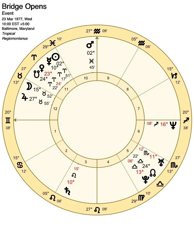 When the Francis Scott Key bridge first opened on 23 March 1977 [9], Mars at 2° of wishy-washy Pisces was the opening chart’s most prominent planet, as shown below. Mars’ return to this exact same spot at the time of the bridge’s collapse reveals its inherent wobbliness. This is restated by Mars’ rulership of a weak, sick house in the opening chart, coupled with an unstable Moon-Uranus opposition and unreliable Neptune descending.